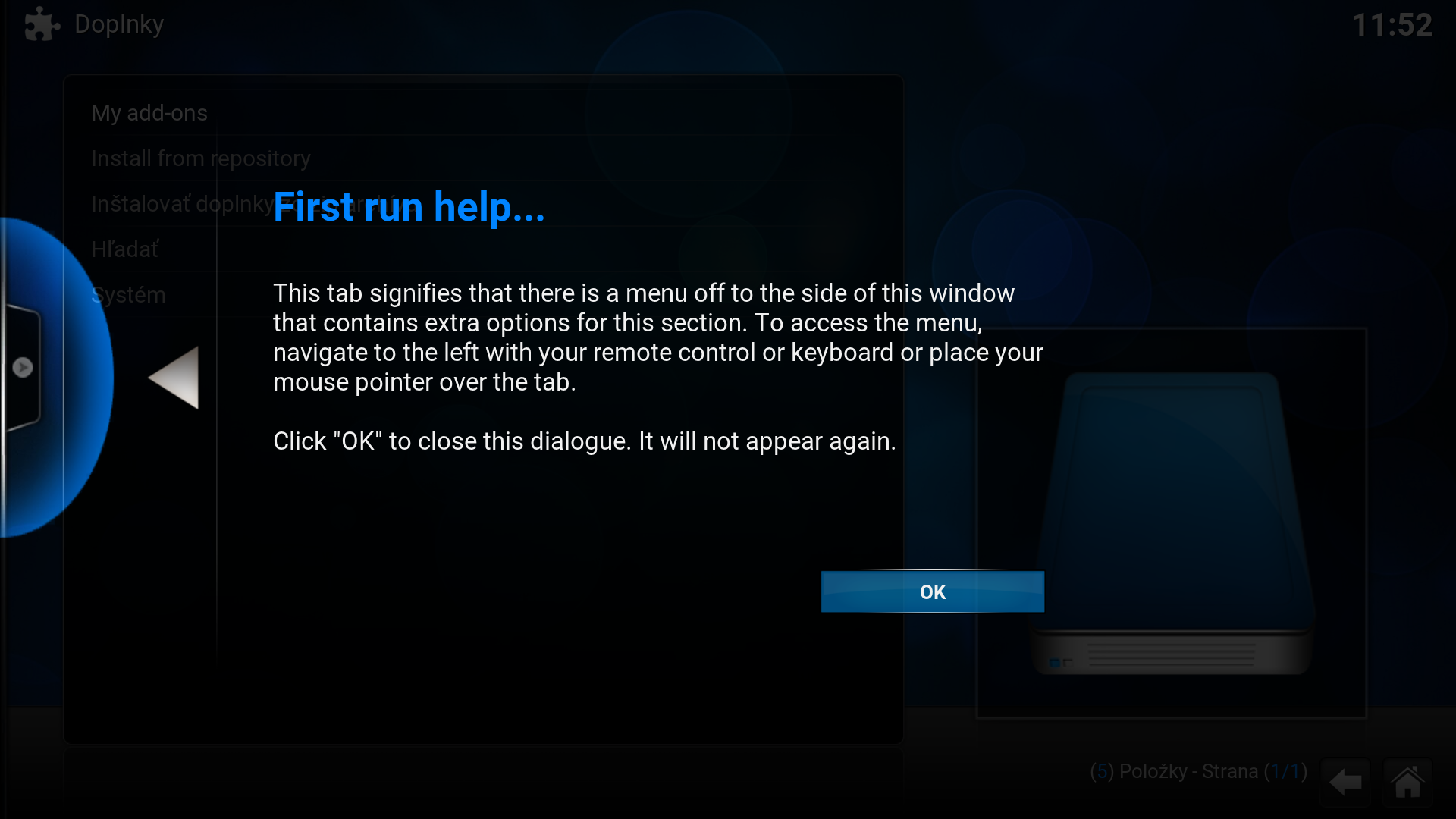 - KODI sa otvorí vo FullScreen (na celú obrazovku). V KODI sa je možné pohybovať buď myšou, alebo klávesnicou. Ja osobne som si zvykol použivať klávesnicu.