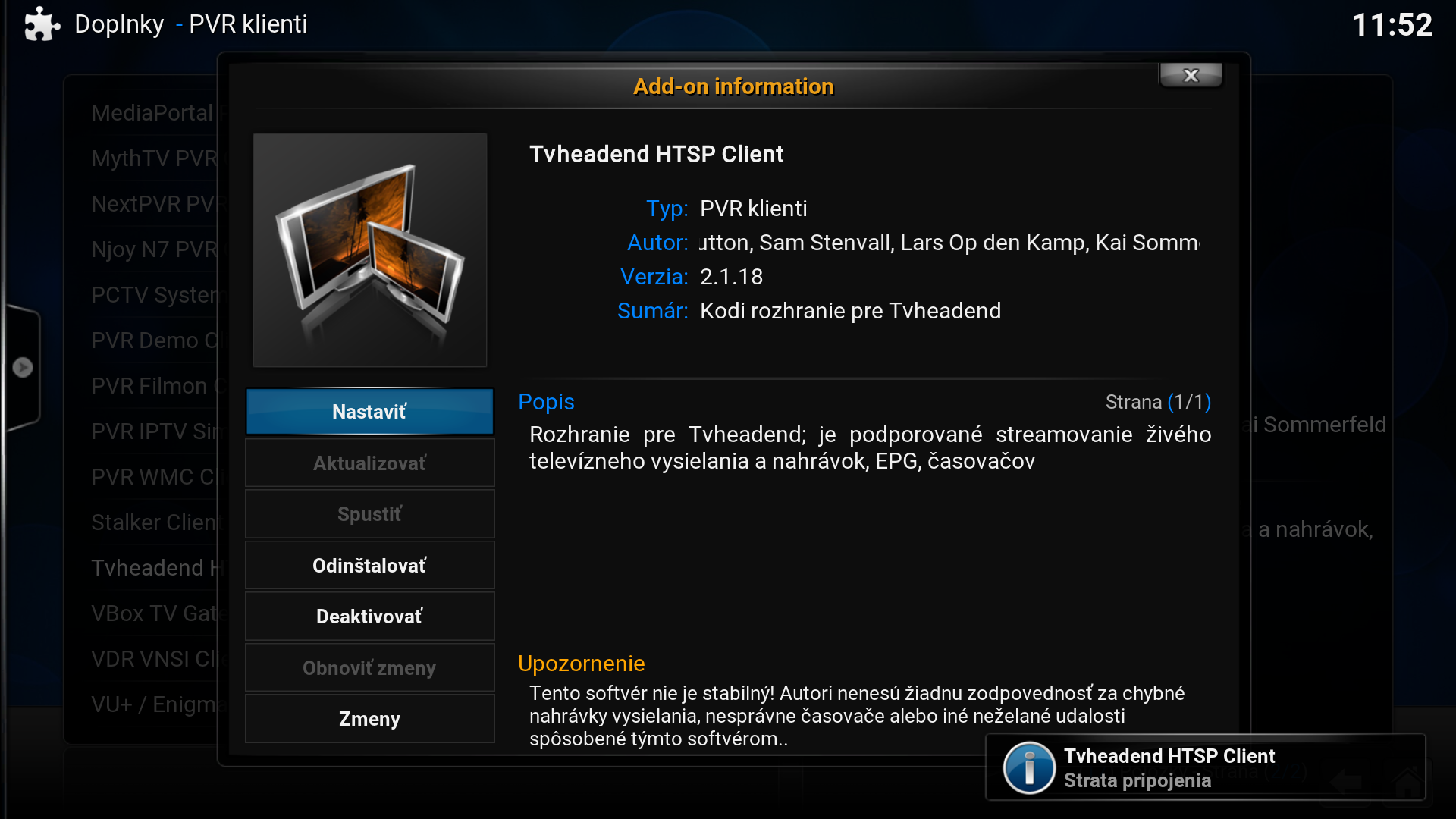 - PVR add-on by mal byť teraz aktivovaný. Ak tomu nie je tak, tak pozri na tento obrázok musí tam byť napísané "Deaktivovať". Ak je tam napísané "Aktivovať" tak na to klikni (alebo potvrď enterom).